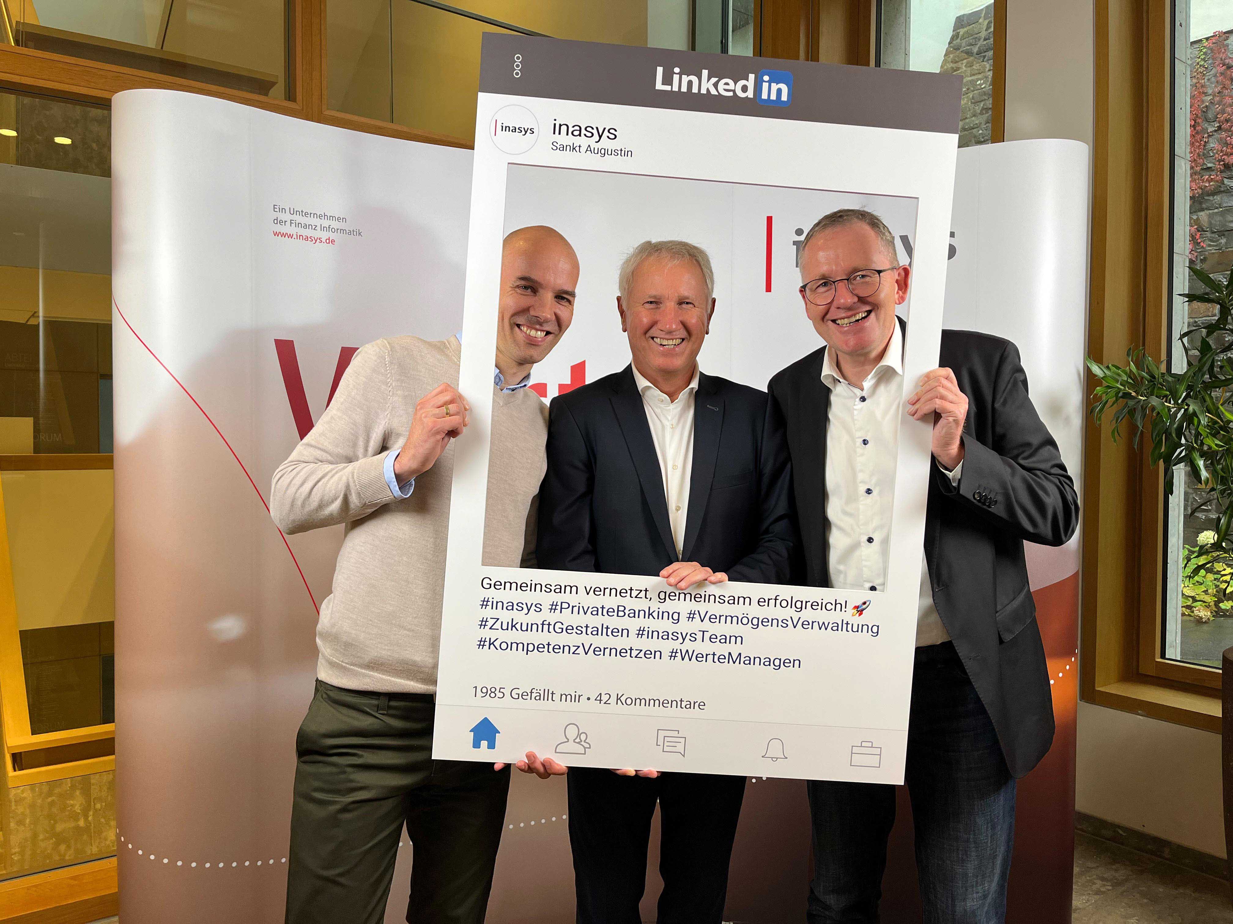 Von links nach rechts: Die neue, erweiterte Geschäftsführung von inasys auf dem AKPB 2024 um Ralf Schuster, Dr. Christian Kastner und Peer Hannig. Rechts mit im Bild: Dominique Didszuweit, Bereichsleiter Produkt- und Partnermanagement.